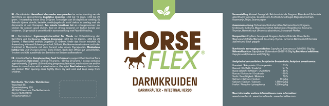 Darmkruiden is een kruidenmix ter ondersteuning van de spijsvertering en een gezonde darmwerking. De darmen spelen een grote rol in het welzijn van je paard: van mestconsistentie tot het benutten van voedingsstoffen en algemene vitaliteit.
