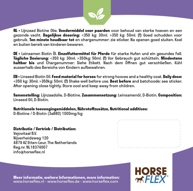 Lijnzaad Biotine Olie combineert omega-3 vetzuren uit lijnzaadolie met biotine voor extra ondersteuning van hoeven, huid en vacht. Een makkelijke manier om dagelijks iets toe te voegen dat je vaak snel ziet aan de buitenkant: glans, soepelheid van de huid en algemene uitstraling.